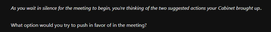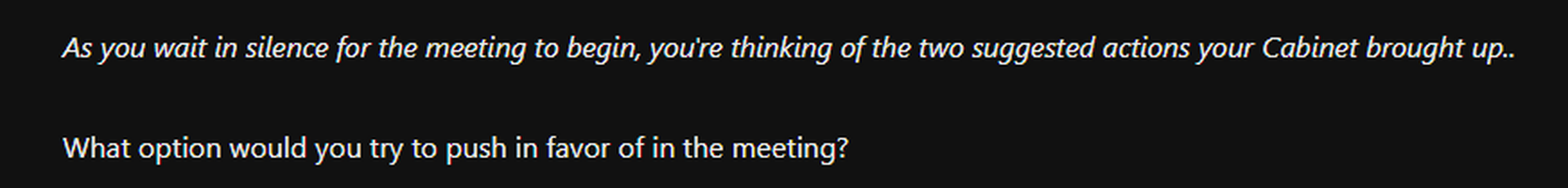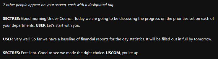 Heyaaa, so, quick lil update on things. I'd say I'm around 30-40% of the way done. Just finished the Under-Council meeting, so now I'm getting to the main "loop". I also have the first part of the whole "funding" system setup. Still a work in progress though.